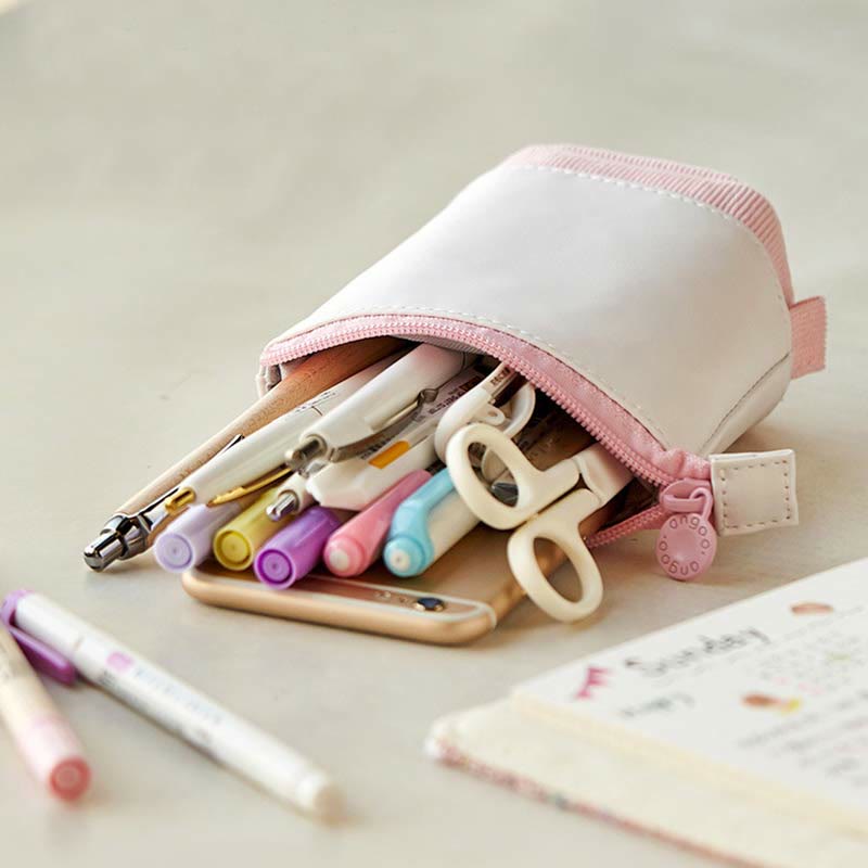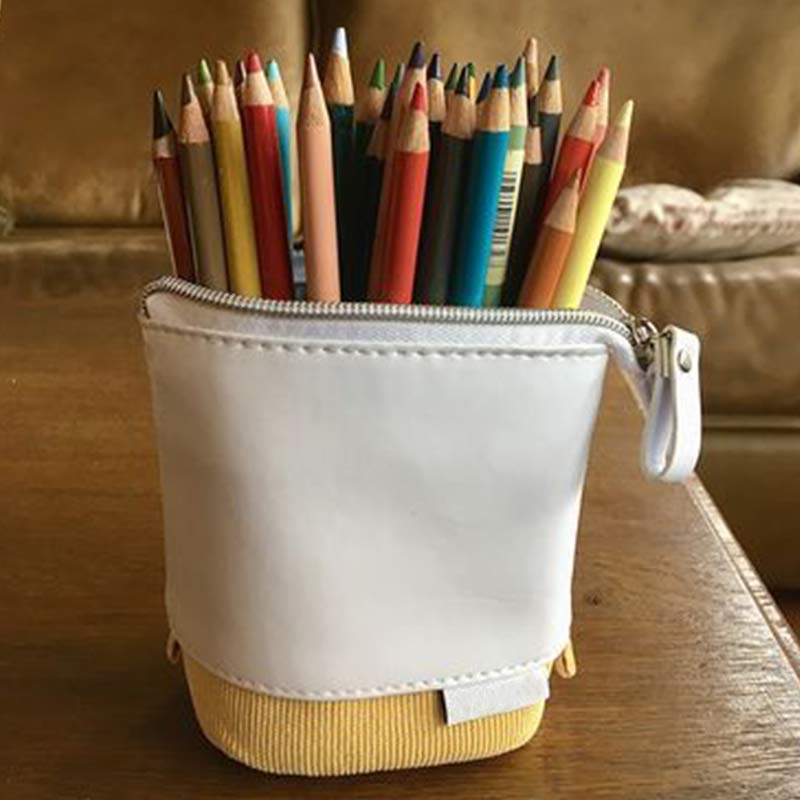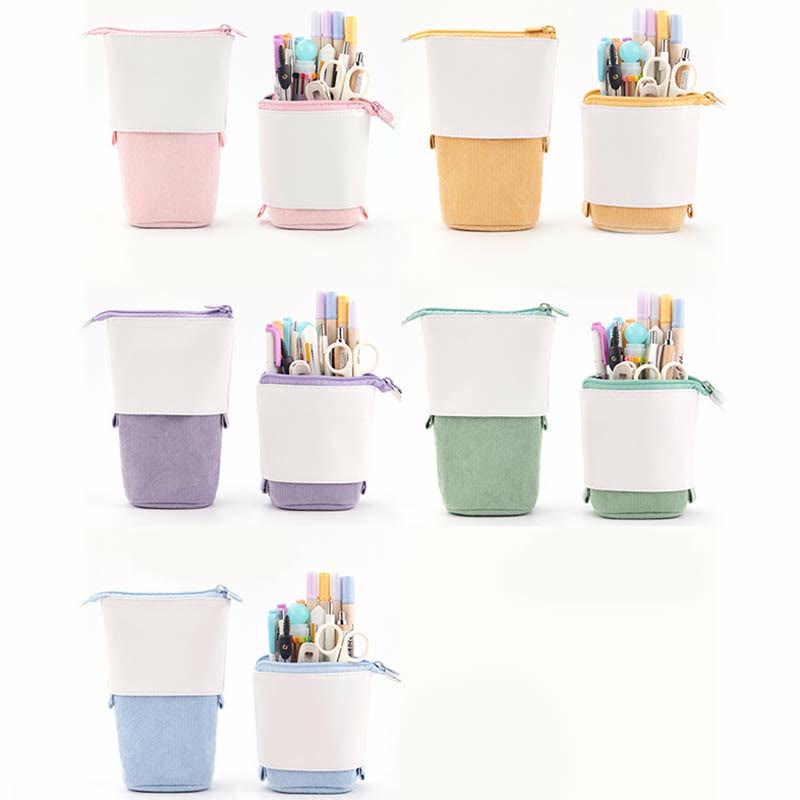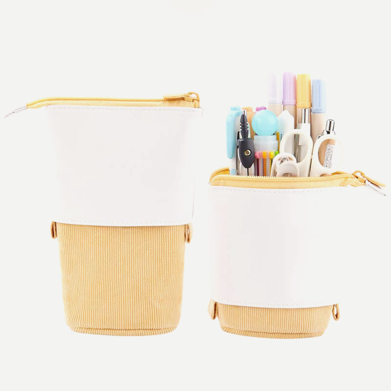 Pop-Up Pencil Case is perfect for storing all your stationery staples! Made from super soft cord + vegan leather, this aesthetic pencil case goes with you, wherever you are. Simply pop it down for a functional desk pen pot, and up for taking on the go!