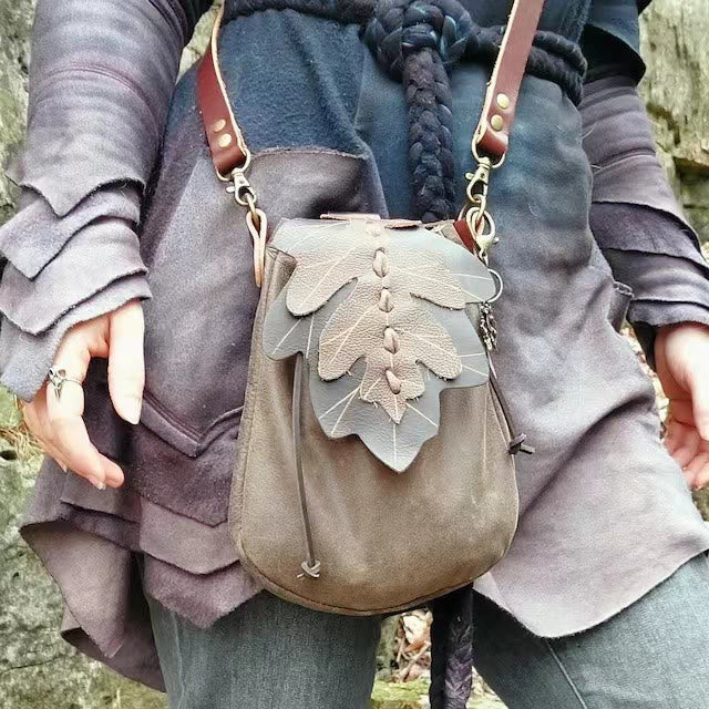 Medieval Crossbody Bag For Women Leaves Pattern Clamshell Drawstring Purse