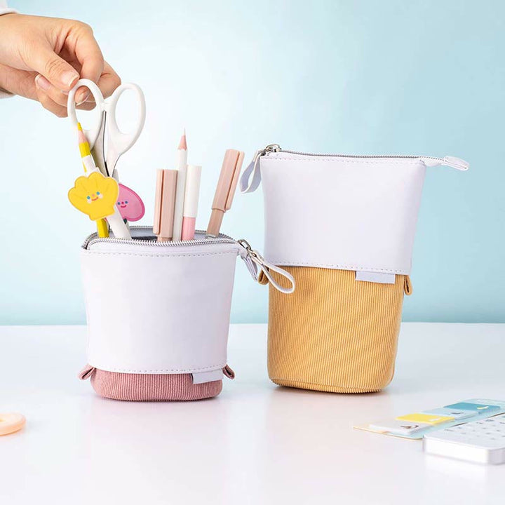 Pop-Up Pencil Case is perfect for storing all your stationery staples! Made from super soft cord + vegan leather, this aesthetic pencil case goes with you, wherever you are. Simply pop it down for a functional desk pen pot, and up for taking on the go!