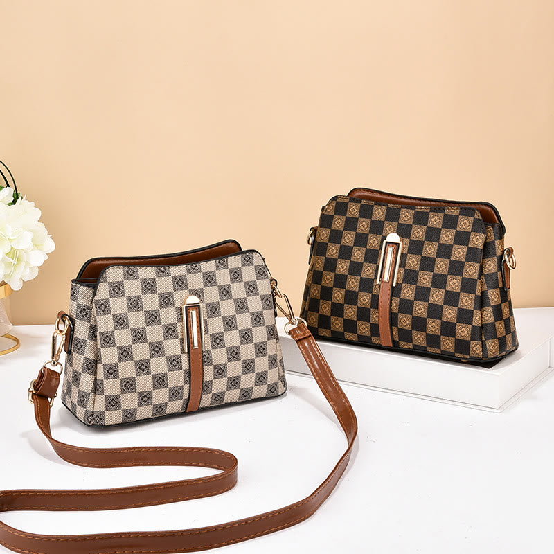 Triple Compartment Plaid Satchel Women Leather Chic Crossbody Bag